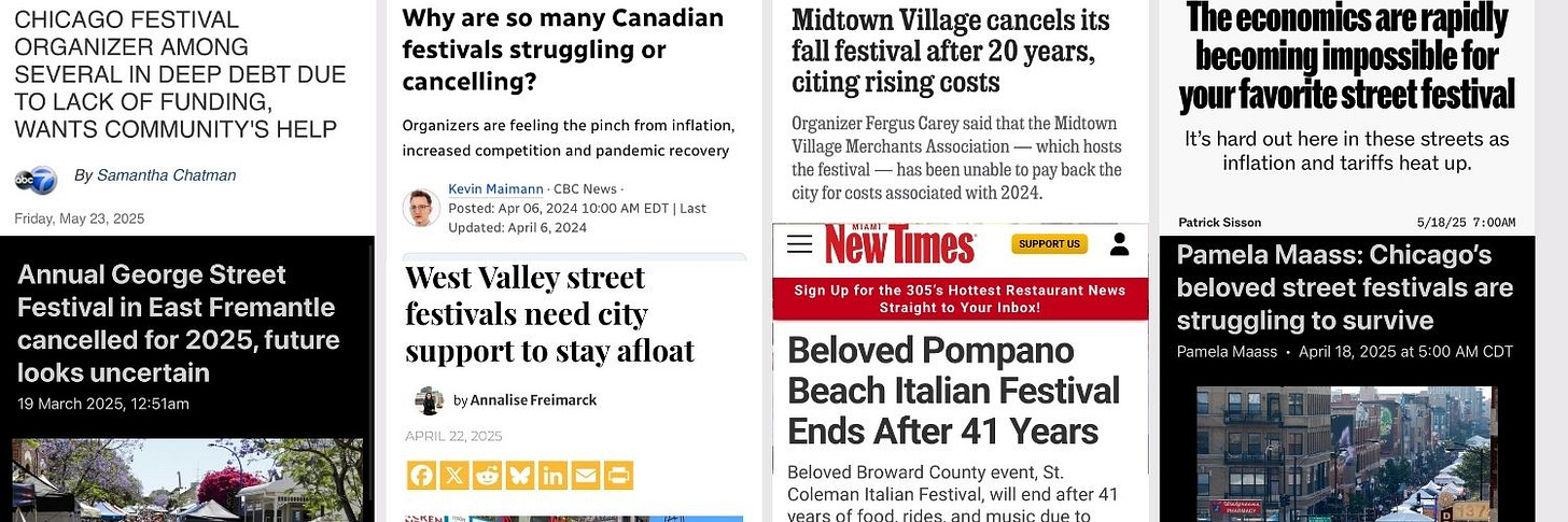 Street festivals across the world Chicago, San Jose, London Montreal, Toronto, Philadelphia, and Perth Australia are canceling, shrinking, or quietly disappearing. To the local public, these decisions might look isolated. To those paying attention the pattern is unmistakable and trending in the wrong direction.